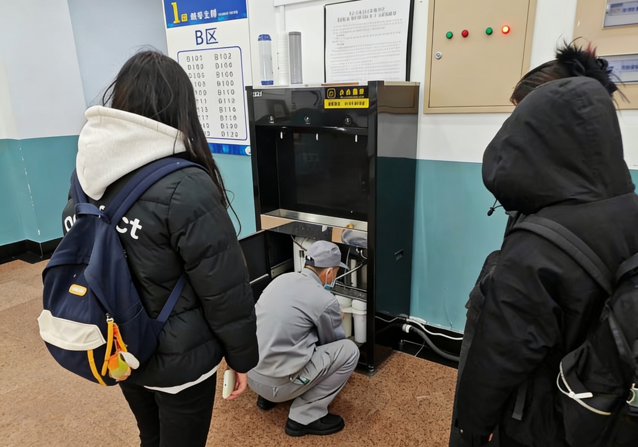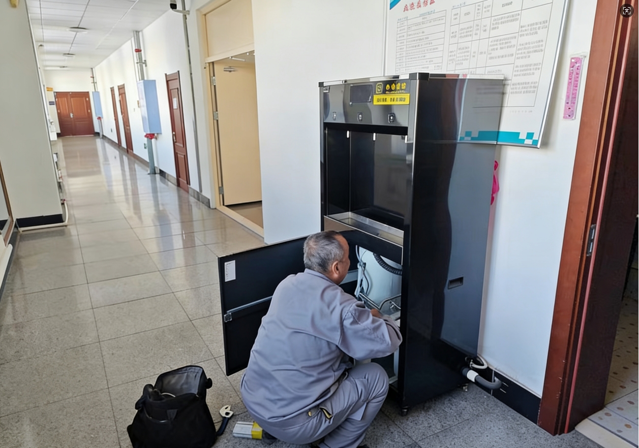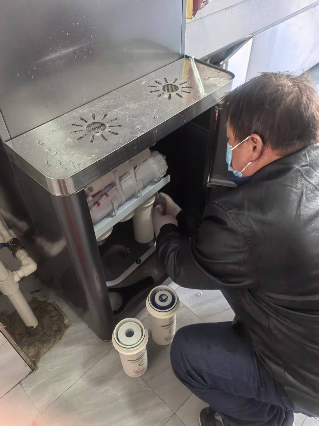 工作人员严格遵循操作规范,细致完成旧滤芯拆卸、新滤芯安装、机身清洁、管路排查、出水调试等全流程作业。全新滤芯安装后,工作人员反复放水冲洗,确保每一台饮水机出水清澈、可用。